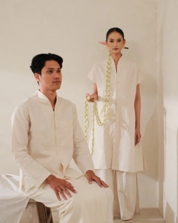 Semangat itu diterjemahkan melalui siluet kebaya dan beskap janggan yang dihadirkan dalam bentuk yang lebih sederhana dan bersih, selaras dengan suasana hari raya yang khidmat. Ditenun dari katun tanpa mesin, dikerjakan dengan sadar dan bertanggung jawab. Setiap helainya menghadirkan tekstur alami dan kenyamanan yang jujur merayakan tradisi dengan cara yang tenang dan bermakna.